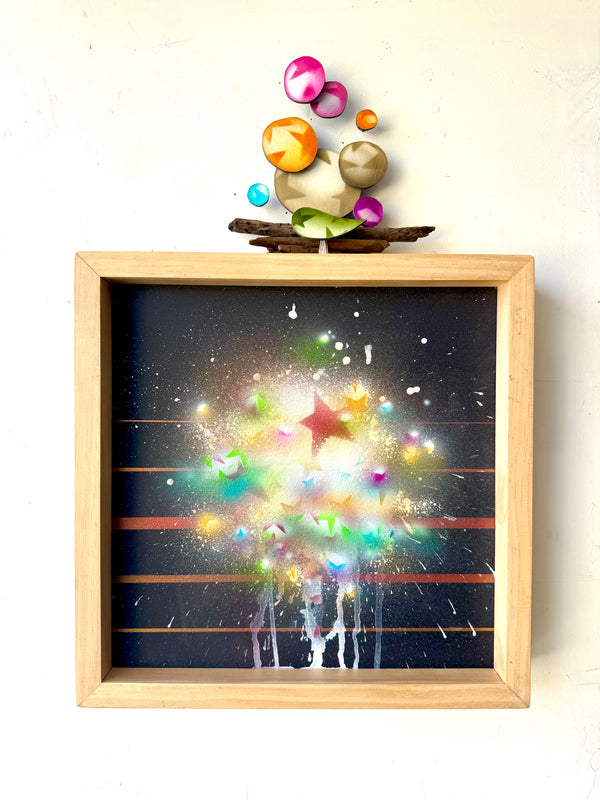 spray paint, airbrush, acrylic on hardboard; stick bundle, floss; paper, airbrush on hardboard
