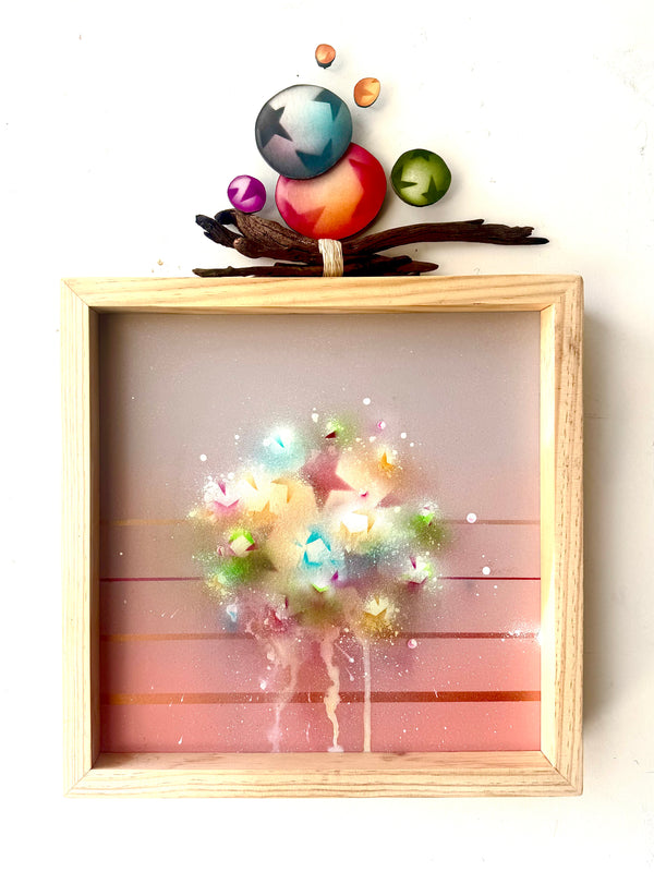 spray paint, airbrush, acrylic on hardboard; stick bundle, floss; paper, airbrush on hardboard