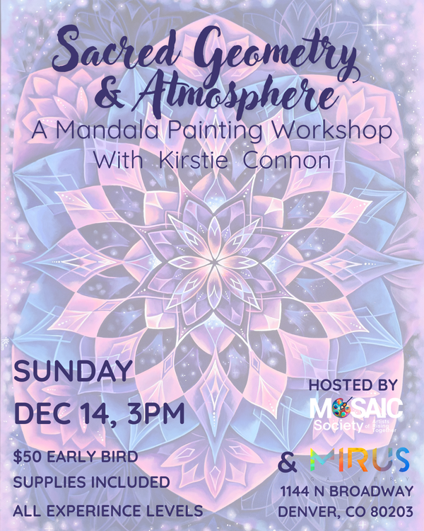 This 2-part workshop will focus on the magic that mandalas bring to paintings through delicacy and precision, followed by experimenting to create the ethereal flow of cloudy textures.