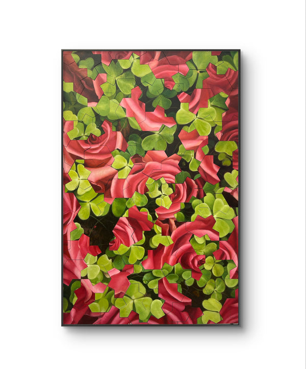 paint on wood assemblage puzzle in handmade wood frame